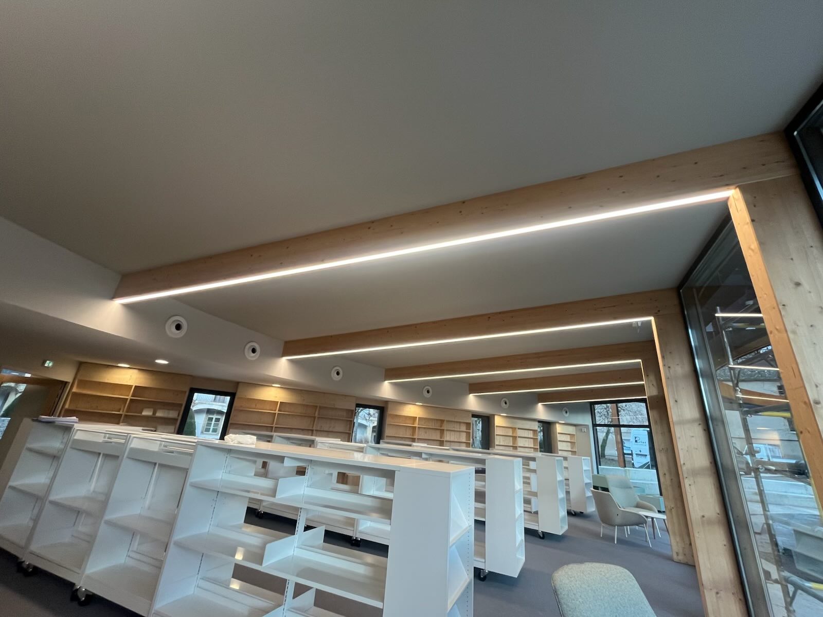 Plafond tendu - Plafond Tend'oc - Occitanie -accoustique coloris galet dans une médiathèque à Saint-Geniez d'Olt